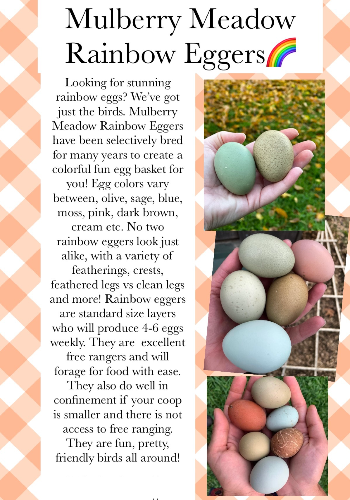 Looking for stunning rainbow eggs? We've got just the birds. Mulberry Meadow Farms Rainbow Eggers have been selectively bred for many years to create a colorful fun egg basket for you! Egg colors vary between, olive, sage, blue, moss, pink, dark brown, cream..etc. No two Rainbow Eggers look just alike, with a variety of featherings, crests, feathered legs vs. clean legs and more!